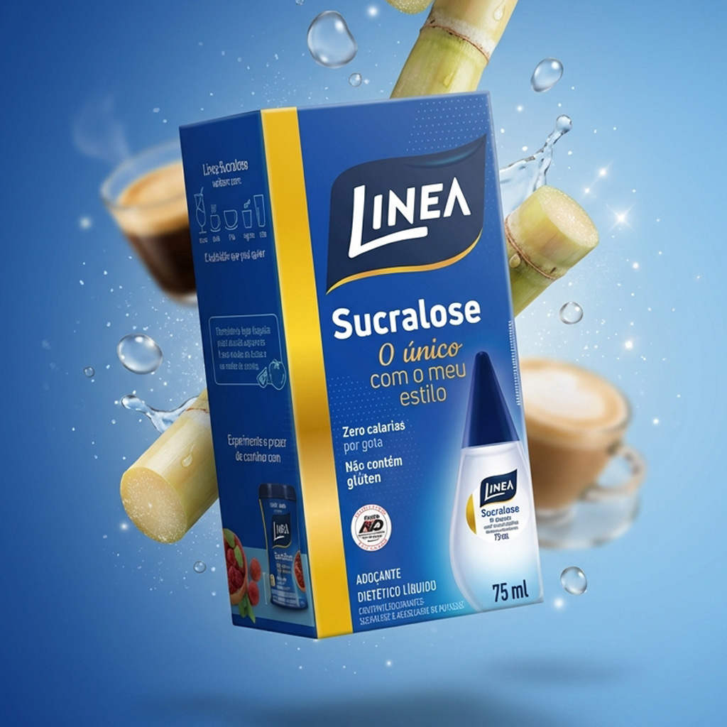Linea Adoçante Líquido Sucralose é derivado da cana-de-açúcar, possui zero calorias e não eleva o açúcar no sangue, sendo indicado para toda a família, inclusive para pessoas com diabetes.