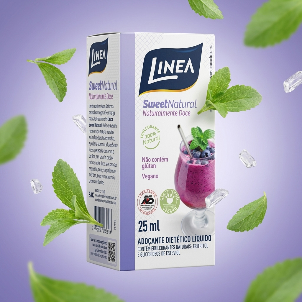 Linea Adoçante Líquido Sweet Natural é um edulcorante 100% natural, feito através de eritritol e de glicosídeos de esteviol. Naturalmente doce, vegano, zero calorias e não contém glúten. Prático para as bebidas, a dose certa de quem quer mais praticidade, em que 5 gotas equivalem a 1 colher de chá de açúcar. Uma opção natural, sem retrogosto, com sabor mais doce!