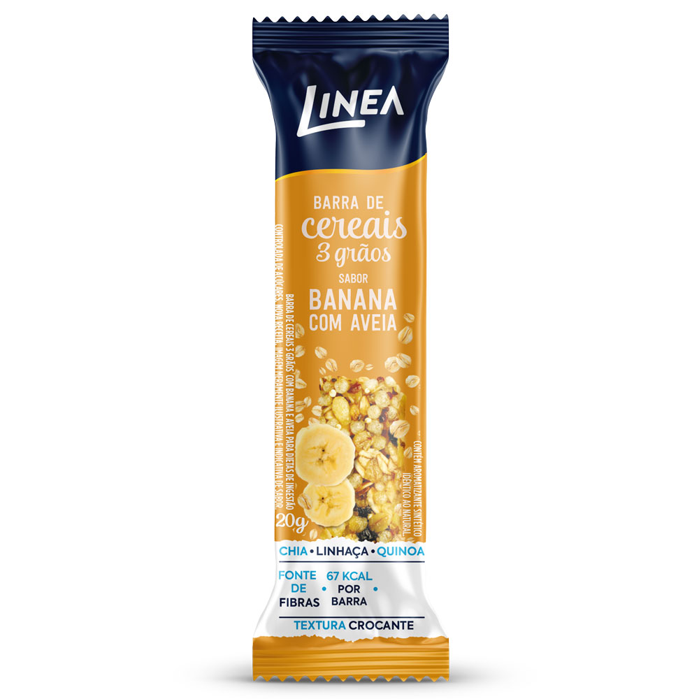 Linea Barra de Cereal 3 Grãos Integrais Banana com Aveia possui o selo vegano, é indulgente, nutritiva e possui 67kcal por barra. Em sua composição, possui 3 grãos integrais, chia, linhaça e quinoa. Fonte de fibras, sem adição de açúcares, é adoçado com maltitol e sorbitol (adoçantes derivados do milho), possui baixo teor de sódio. Tudo isso com uma estrutura crocante e deliciosa, sendo ideal para segurar a fome até a próxima refeição.