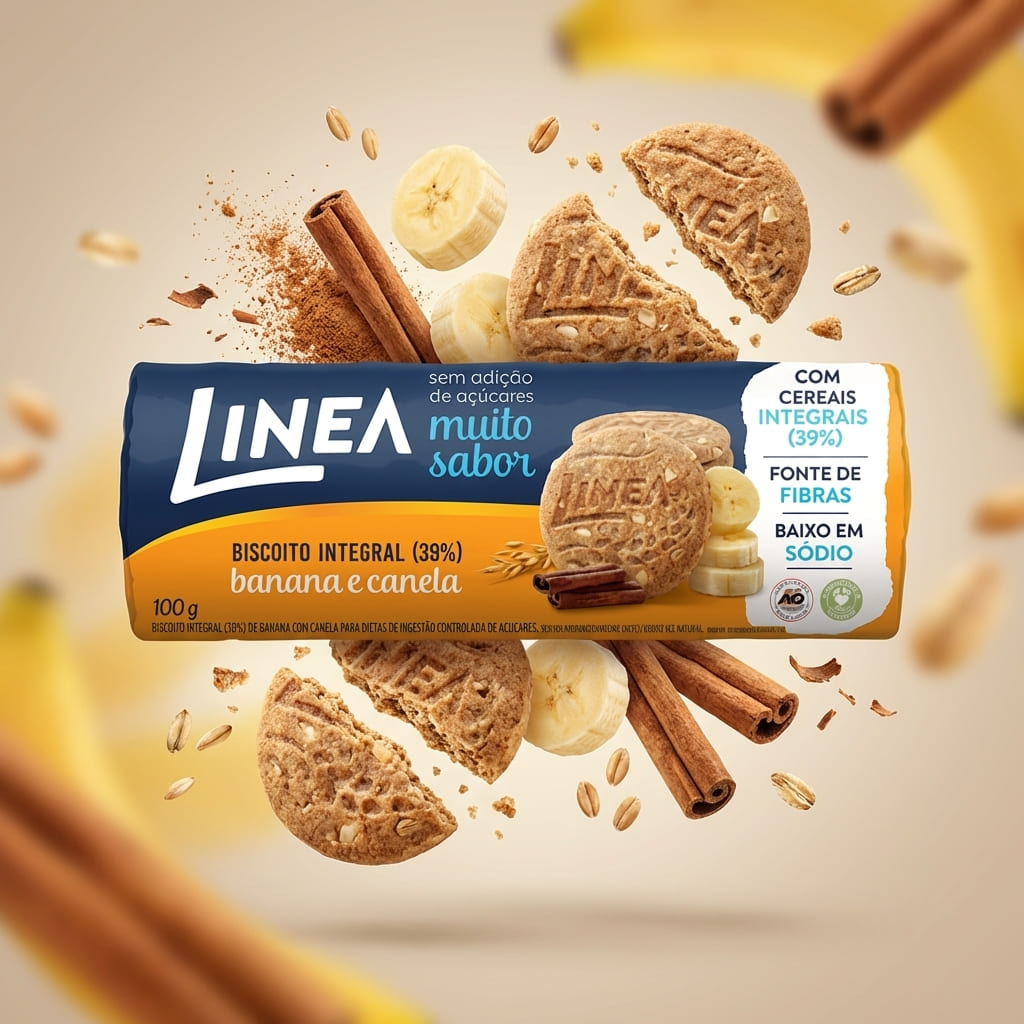 Linea Biscoito Integral Banana e Canela: Equilibre saúde e sabor! Sem adição de açúcares, com cereais integrais, adoçado com stevia e vegano. Rico em fibras, baixo em sódio. Uma escolha deliciosa e consciente para nutrir seu corpo. Ótimo para quem procura um snack saudável e também para receitas que utilizam biscoitos!