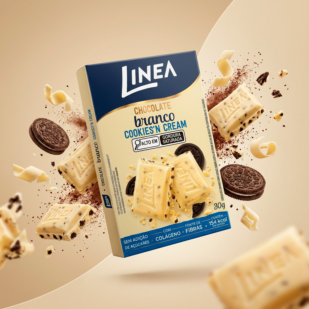 Linea Chocolate Branco Cookies n’Cream é sem adição de açúcares. Adoçado com sucralose e maltitol, contém 154kcal por porção. Com a manteiga de cacau como o 1º ingrediente, resulta em um chocolate macio e cremoso. Possui colágeno, e é fonte de fibras. Sabor indescritível que derrete na boca!