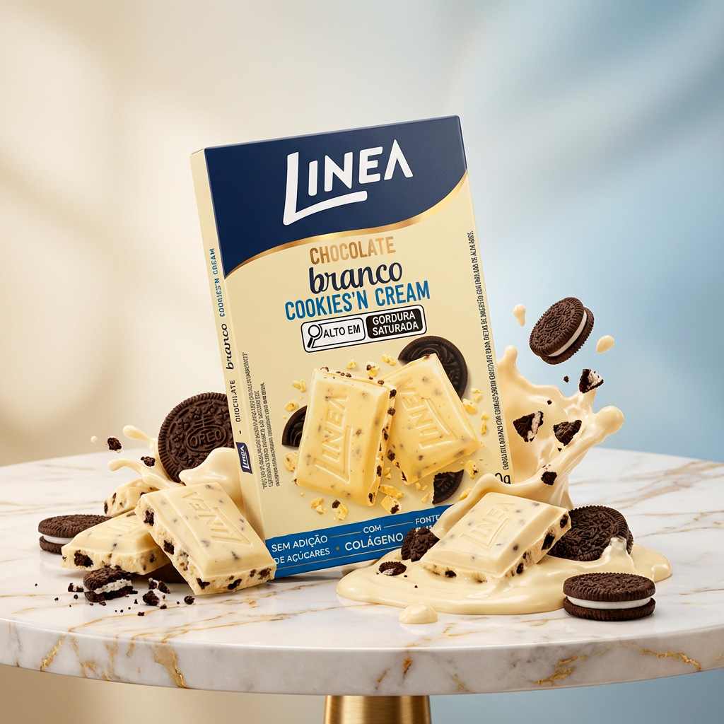 Linea Chocolate Branco Cookies n’Cream é sem adição de açúcares. Adoçado com sucralose e maltitol, contém 154kcal por porção. Com a manteiga de cacau como o 1º ingrediente, resulta em um chocolate macio e cremoso. Possui colágeno, e é fonte de fibras. Sabor indescritível que derrete na boca!