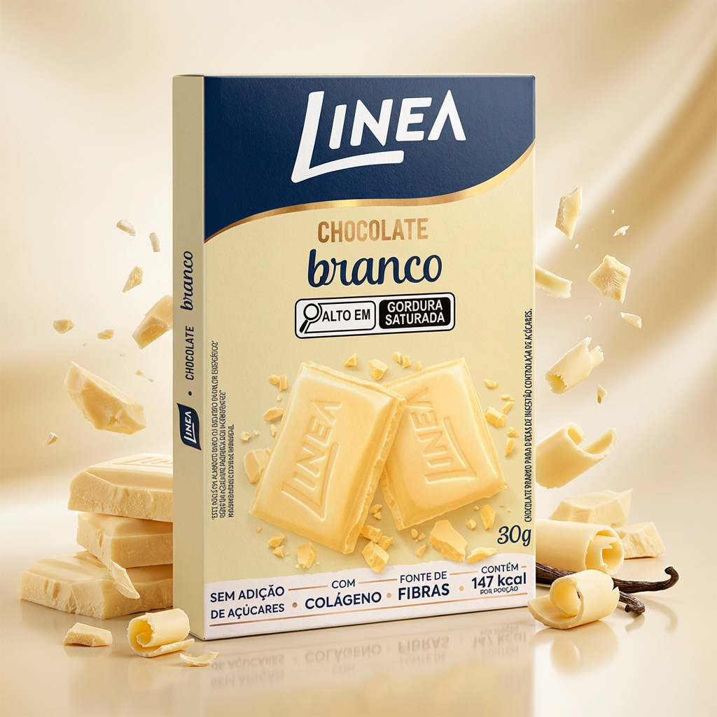 Linea Chocolate Branco é sem adição de açúcares. Adoçado com sucralose e maltitol, contém 147kcal por porção. Com a manteiga de cacau como o 1º ingrediente, resulta em um chocolate macio e cremoso. Com colágeno, é fonte de fibras. Sabor indescritível que derrete na boca!