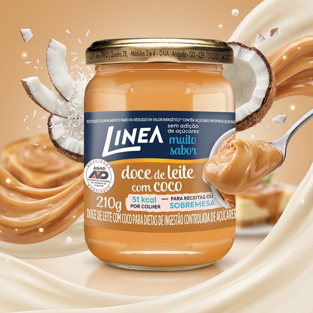 Linea Doce de Leite com Coco possui uma cremosidade que vem do cozimento. Sem adição de açúcares, é adoçado com sucralose, o adoçante derivado da cana de açúcar que contribui para a redução de sódio e calorias. Com coco ralado integral, baixo teor de sódio, contém 51 kcal por colher, e pode ser utilizado para o preparo de doces ou sobremesas.