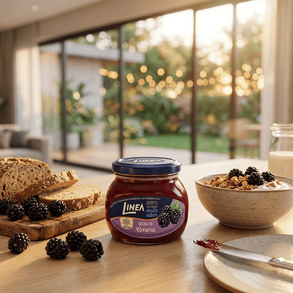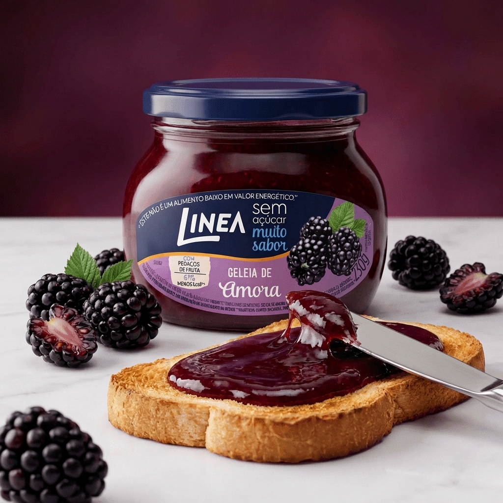Geleia de Amora Linea é cremosa, sem adição de açúcar, repleta de sabor e pedaços da fruta. Com a amora como 1º ingrediente, essa delícia é 63% menos calórica que geleias com açúcar. Uma explosão de doçura saudável para transformar suas refeições.