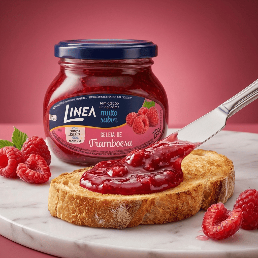 Geleia de Framboesa Linea é cremosa, sem adição de açúcar, repleta de sabor e pedaços da fruta. Com a framboesa como 1º ingrediente, essa delícia é 68% menos calórica que geleias com açúcar. Uma explosão de doçura saudável para transformar suas refeições.