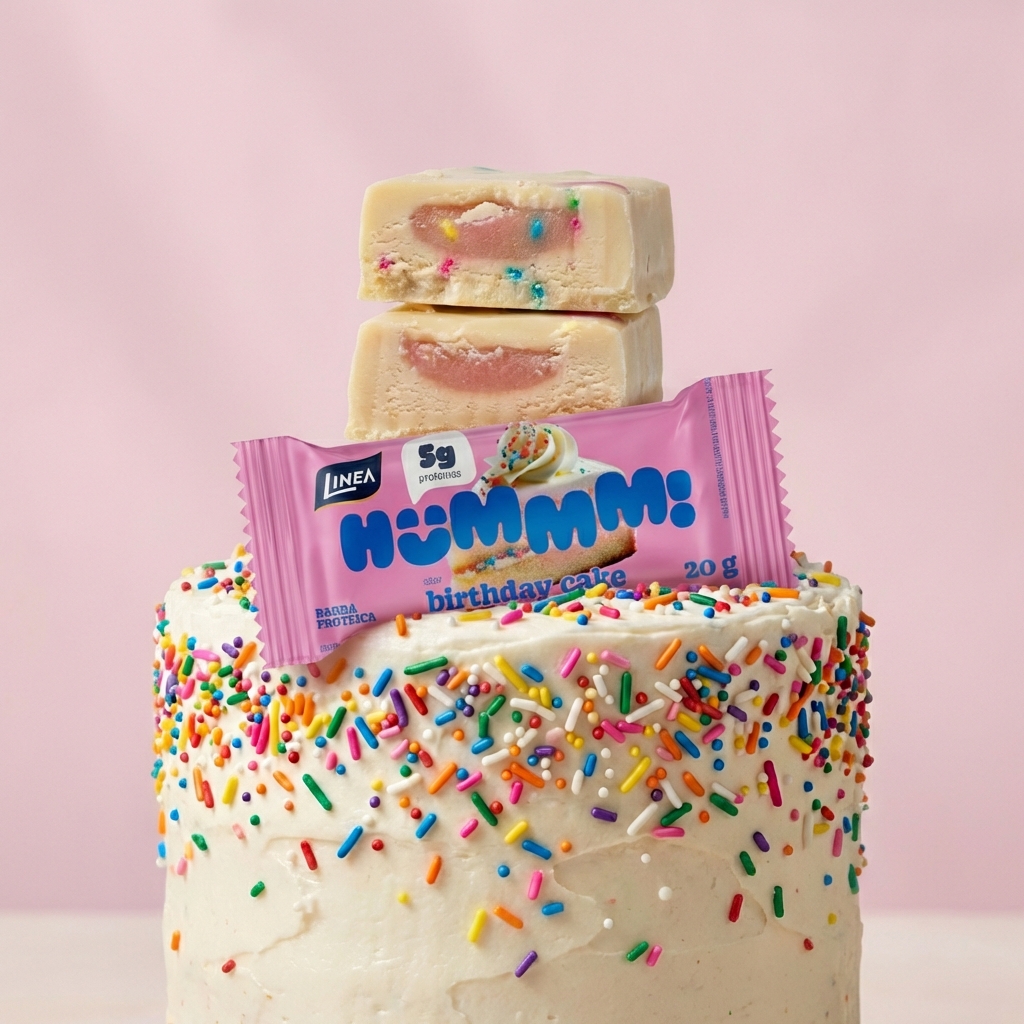 O Hummm! é o docinho proteico que combina sabor e nutrição em cada mordida. Com sabor inspirado no clássico bolo de aniversário, ele entrega 5g de proteína por unidade, colágeno na fórmula e zero adição de açúcar. Uma opção prática para matar a vontade de doce sem sair da rotina.