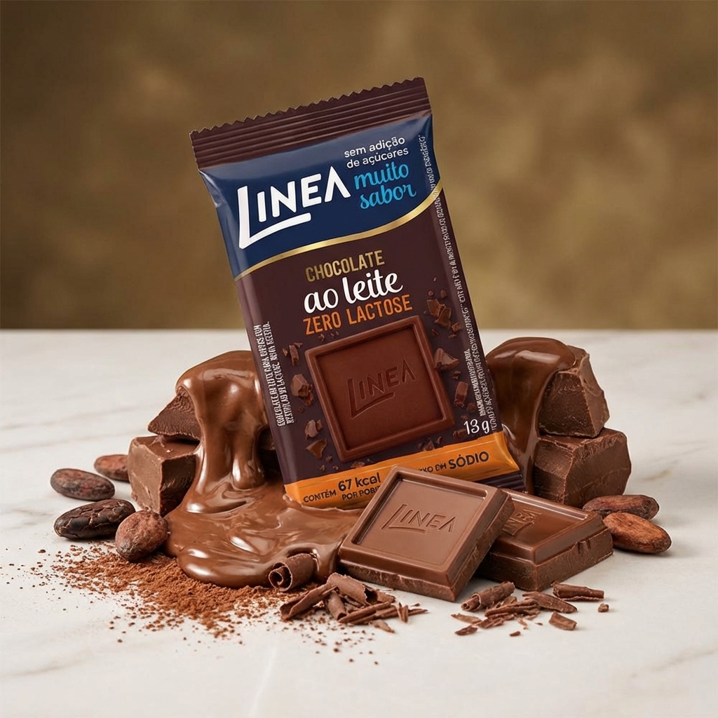 Linea Chocolate Ao Leite Zero Lactose é sem adição de açúcares. Adoçado com sucralose e maltitol, contém 67kcal por porção. Com a manteiga de cacau como o 1º ingrediente, resulta em um chocolate macio e cremoso, além de ser baixo em sódio. Sabor indescritível que derrete na boca e ainda faz bem!