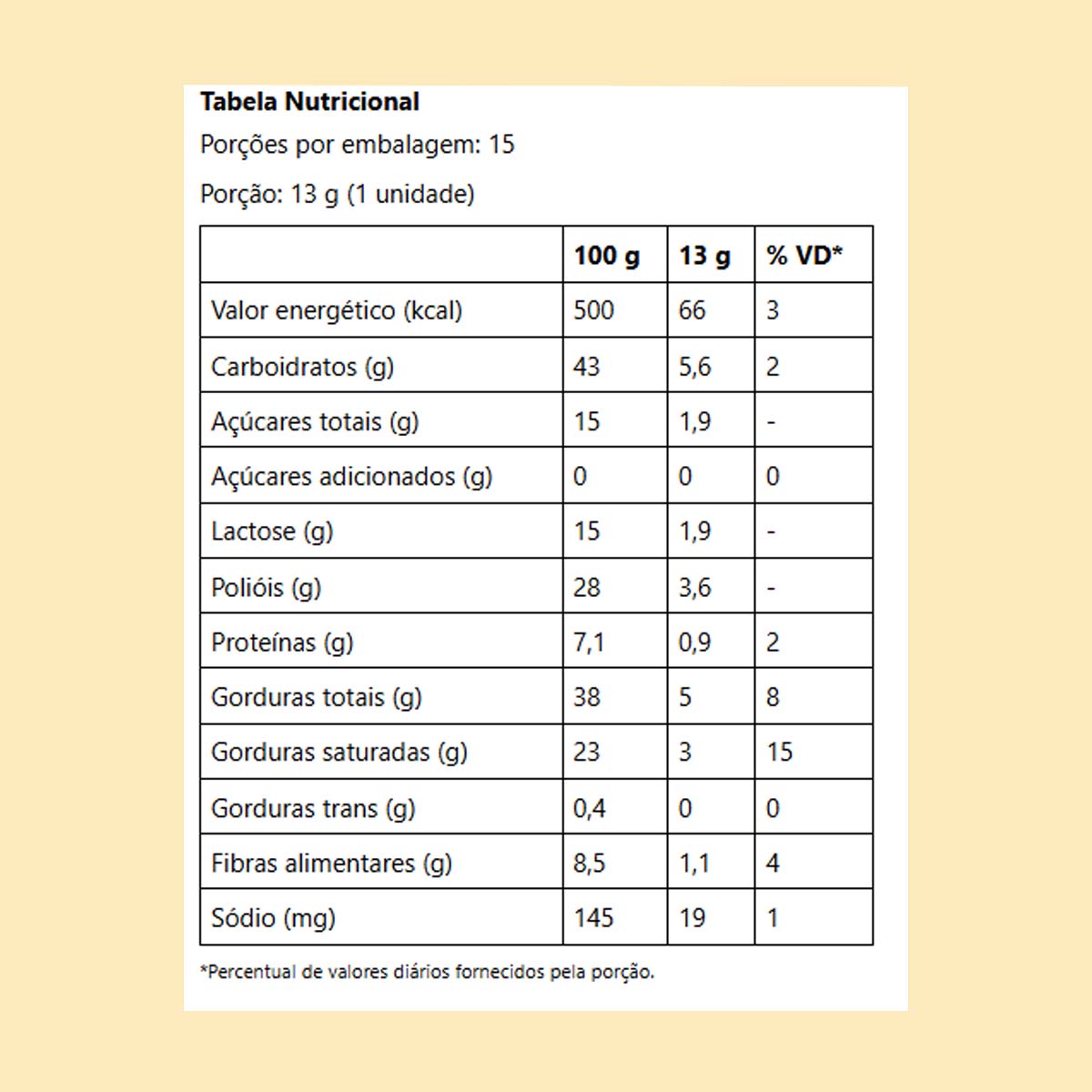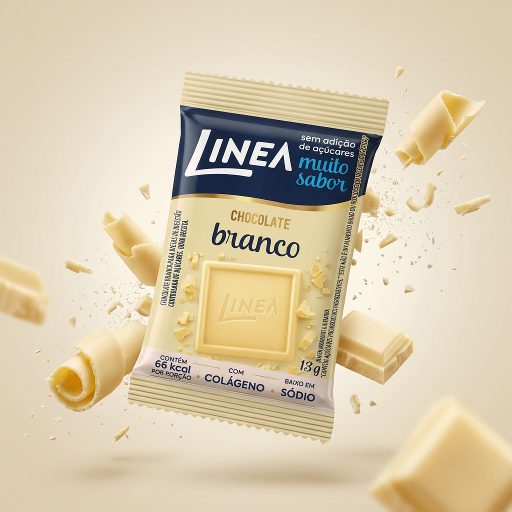 Linea Chocolate Branco é sem adição de açúcares. Adoçado com sucralose e maltitol, contém 66kcal por porção. Com a manteiga de cacau como o 1º ingrediente, resulta em um chocolate macio e cremoso. Possui colágeno, e é baixo em sódio. Sabor indescritível que derrete na boca e ainda faz bem!