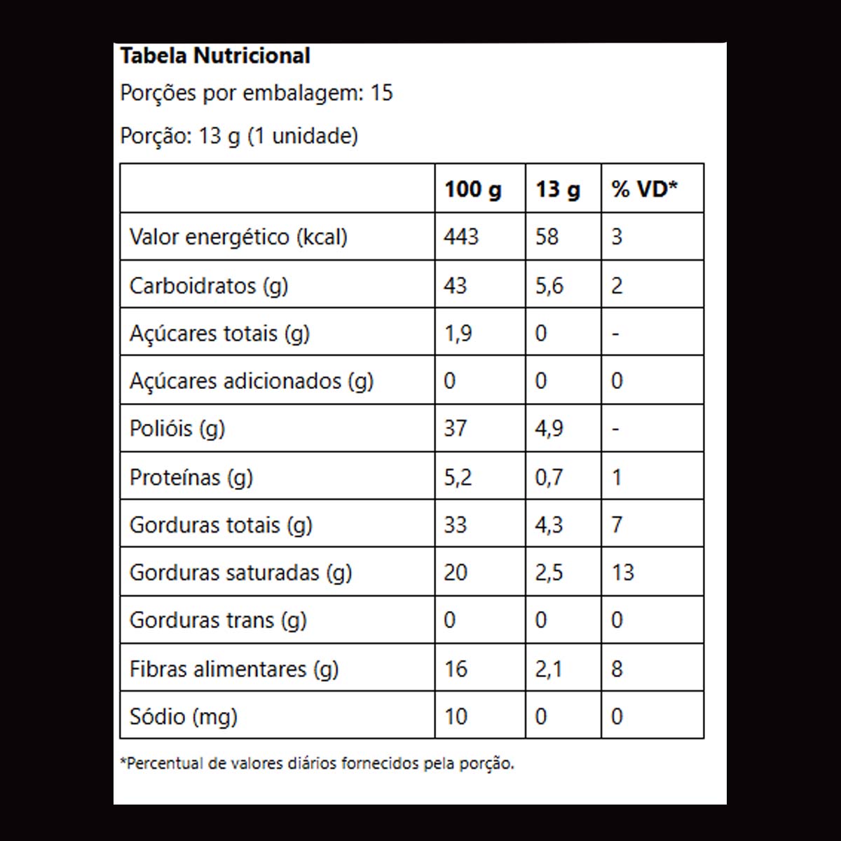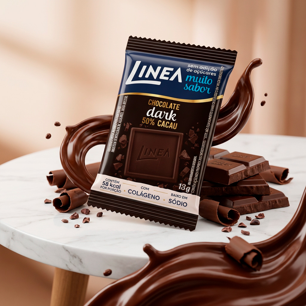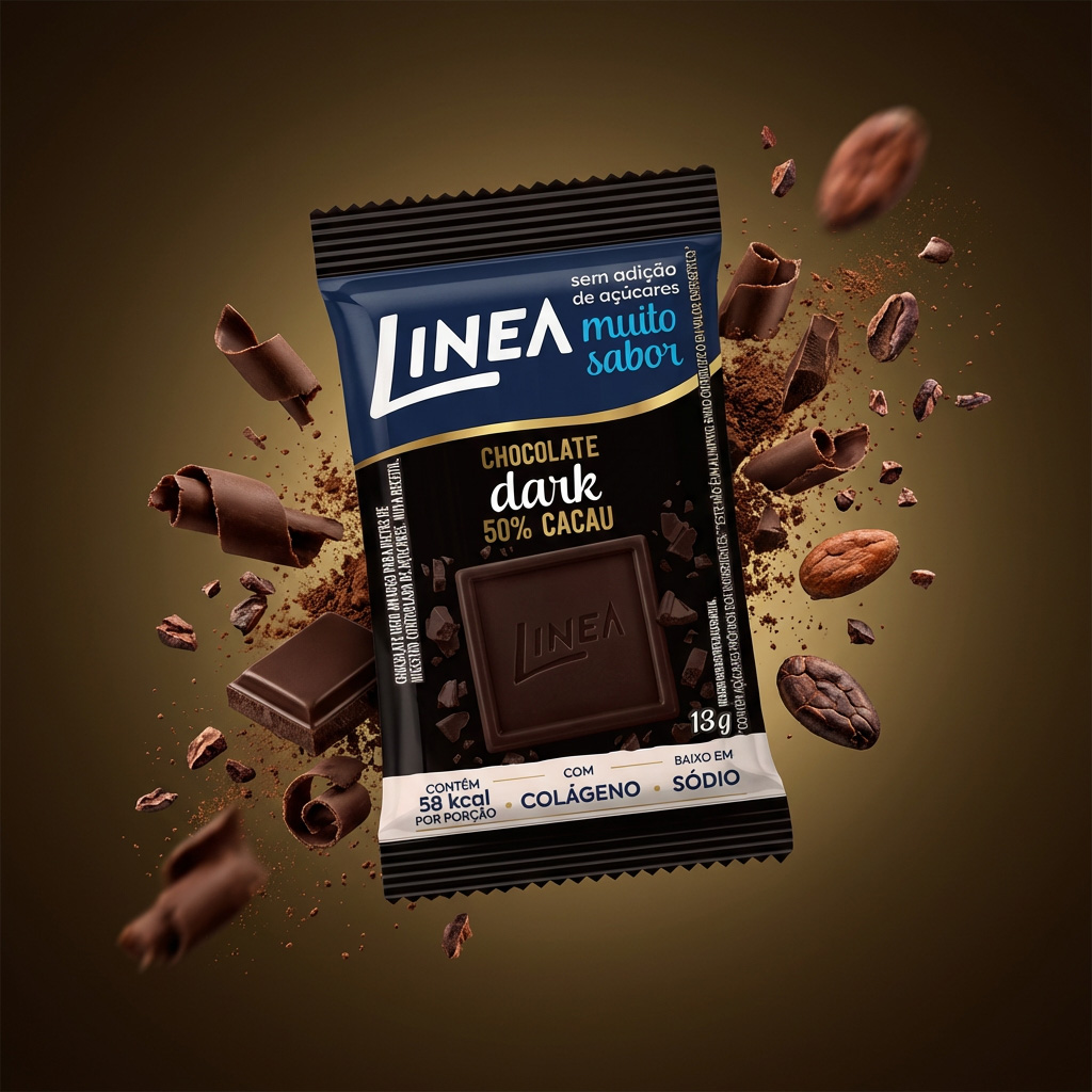 Linea Chocolate Dark 50% Cacau é sem adição de açúcares. Adoçado com sucralose e maltitol, contém 58kcal por porção. Com a manteiga de cacau como o 1º ingrediente, resulta em um chocolate macio e cremoso. Possui colágeno, e é baixo em sódio. Sabor indescritível que derrete na boca e ainda faz bem!