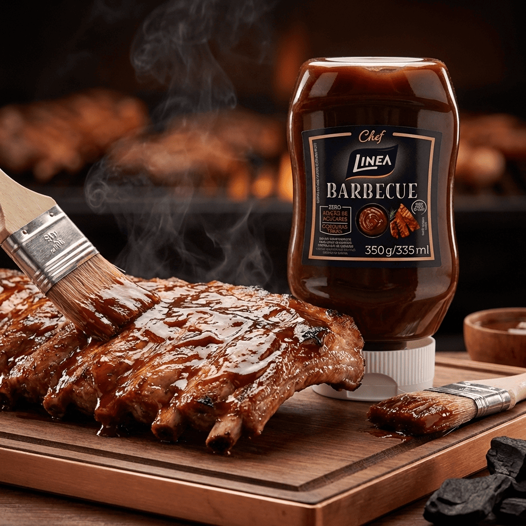 Linea Molho de Barbecue é sem açúcar, zero sódio e cheio de sabor! Feito com polpa de tomate, cebola, vinagre, páprica, mostarda, e pimenta caiena. E ainda é zero calorias, proporcionando uma experiência deliciosa e saudável.