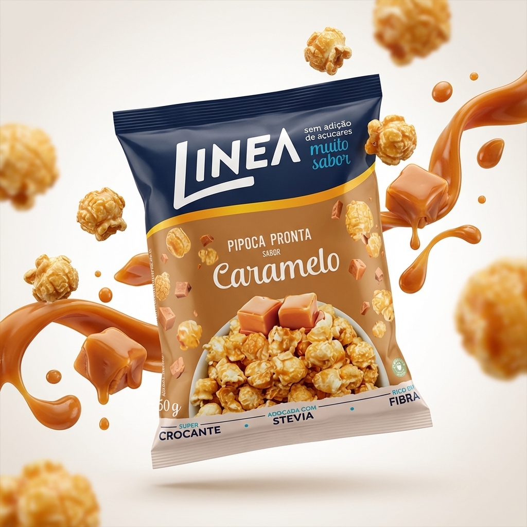 Pipoca de Caramelo Linea é sem adição de açúcares, repleta de sabor, crocância e fonte de fibras. Feita com milho não transgênico, sem corantes artificiais. Adoçada com Stevia, proporcionando 27% menos calorias que as opções açucaradas. Uma delícia indulgente, equilibrada e consciente.